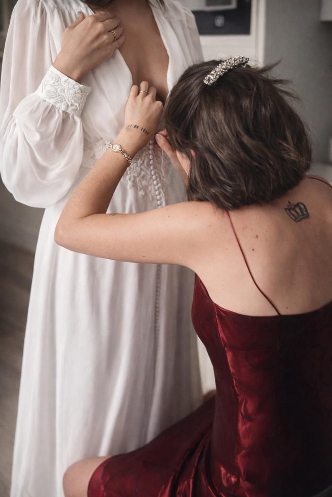 Durante las pruebas analizamos también la parte estética; complementos, peinados, zapatos, joyas o cualquier elemento que quieras incorporar. Puedes traerlos para ver el conjunto completo y asegurarnos de que todo dialogue con coherencia.