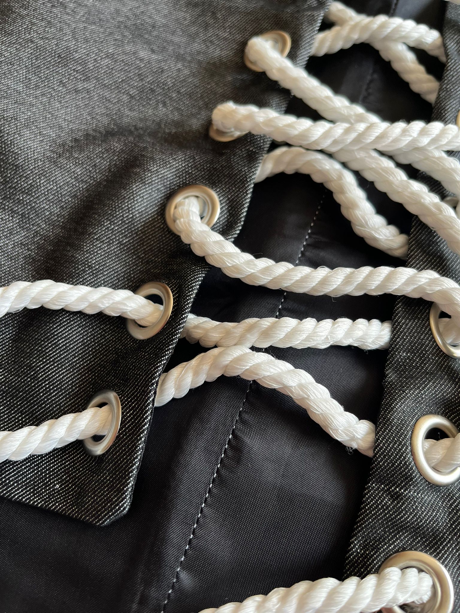 El cierre trasero con cuerda reciclada permite ajustar el corsé al cuerpo y acentúa su estética artesanal, manteniendo al mismo tiempo la coherencia con la filosofía de reutilización consciente que define la colección.