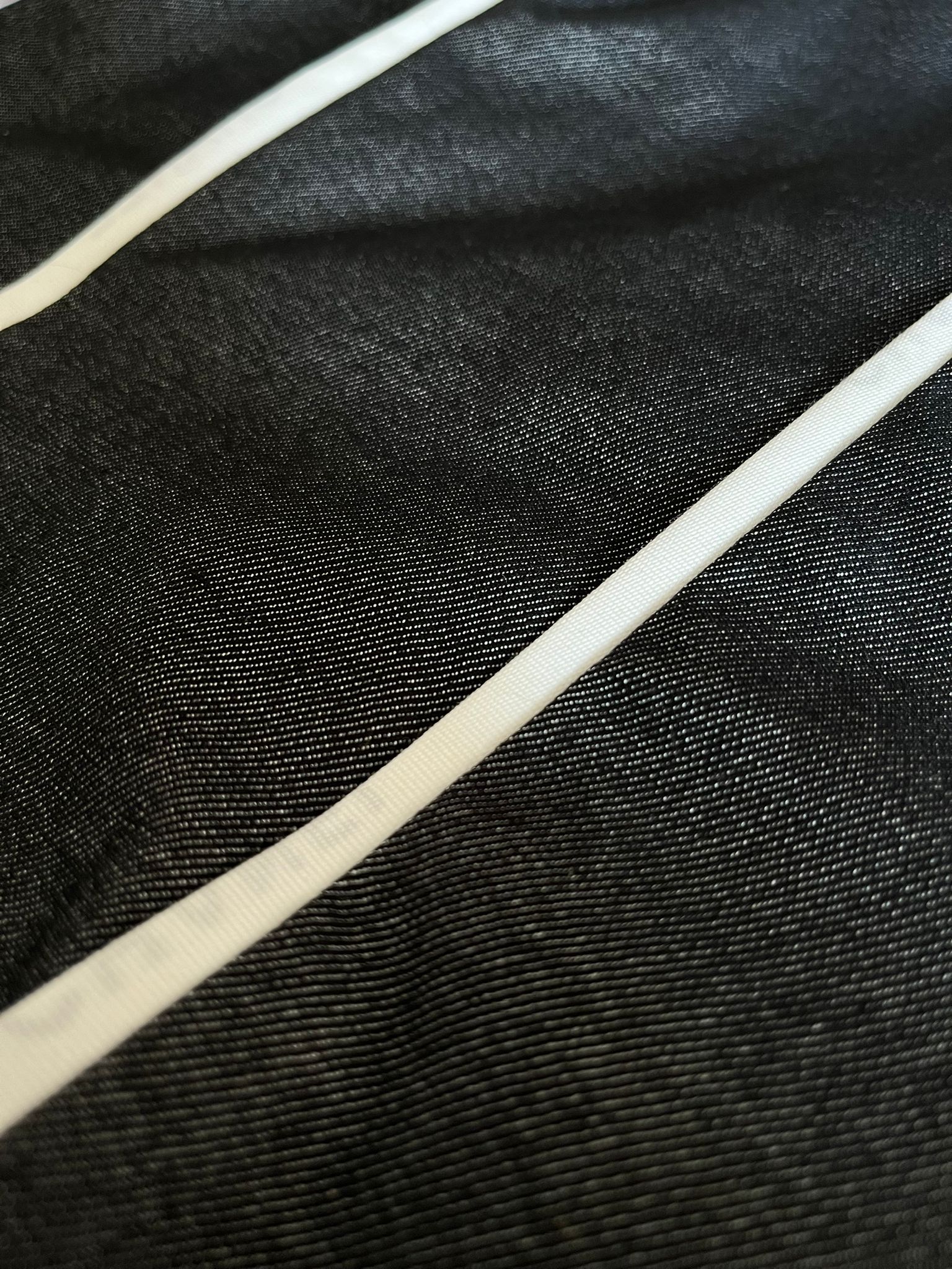 Uno de sus detalles más especiales son las varillas visibles en contraste, elaboradas a partir de cintas recicladas procedentes de una firma de alta costura, lo que añade un valor singular a la pieza y refuerza su carácter único. Este juego de líneas blancas sobre la base oscura aporta estructura visual, definición y un acabado más refinado.